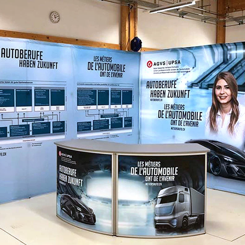 Damit Ihre Sektion oder Ihre Garage an der nächsten Regional- oder Berufsmesse jeder Besucherin und jedem Besucher sofort ins Auge sticht und einen positiven und vor allem auch bleibenden Eindruck hinterlässt, hat der AGVS auch die passenden Roll-ups, Beachflags sowie Messwände im Angebot.