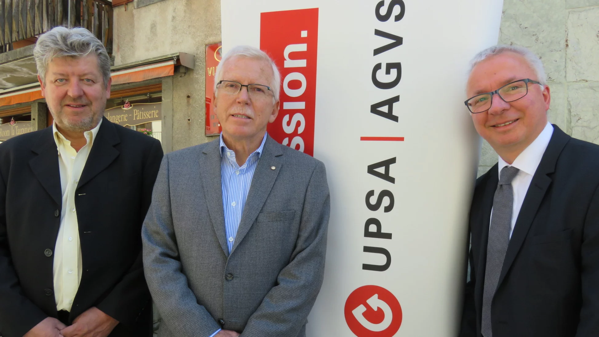 Von links nach rechts, Jean-Philippe Fumeaux ernannt zum Ehrenmitglied im Jahr 2025 und Paul Antille langjährige Ehrenmitglieder mit Charles-Albert Hediger Präsident der Sektion VS